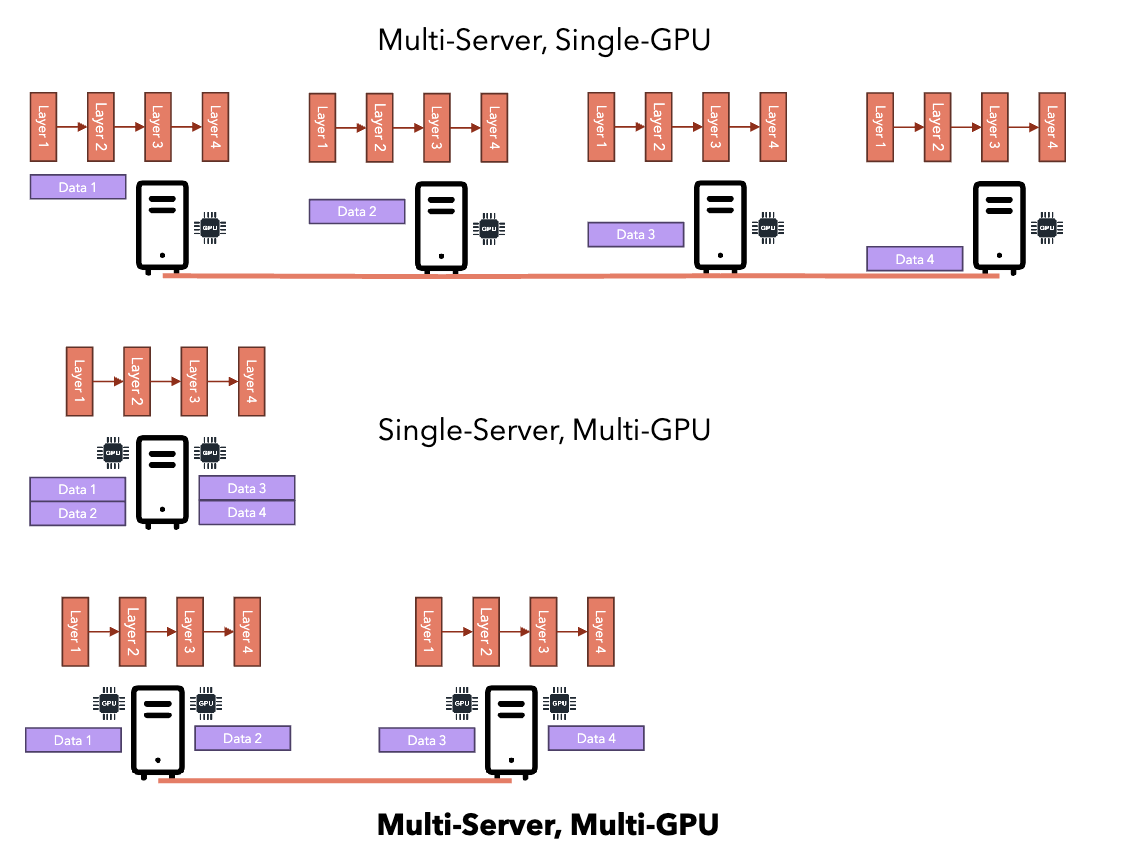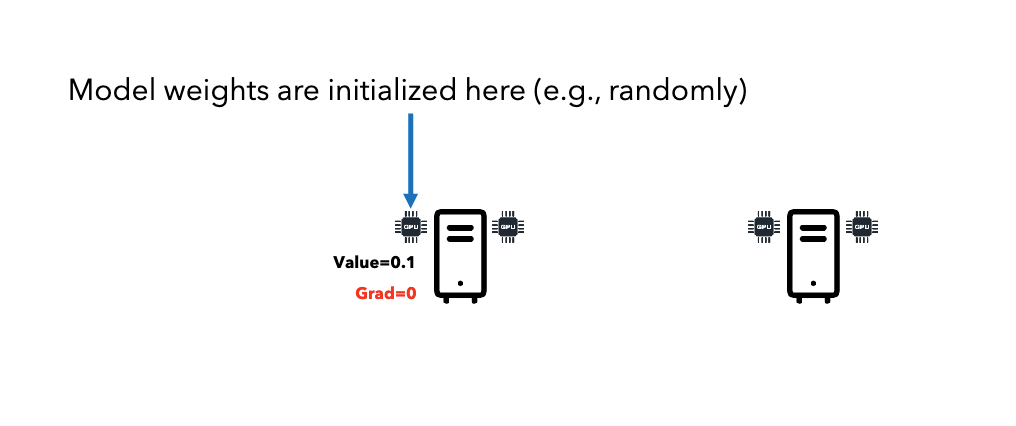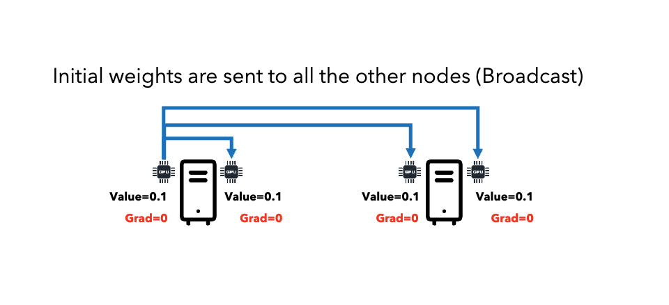 Broadcast: Initialize model weights on one node, send to all nodes.