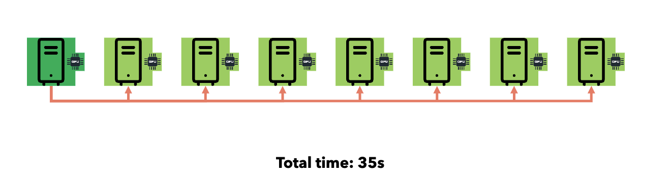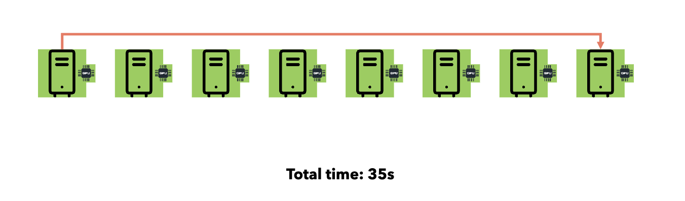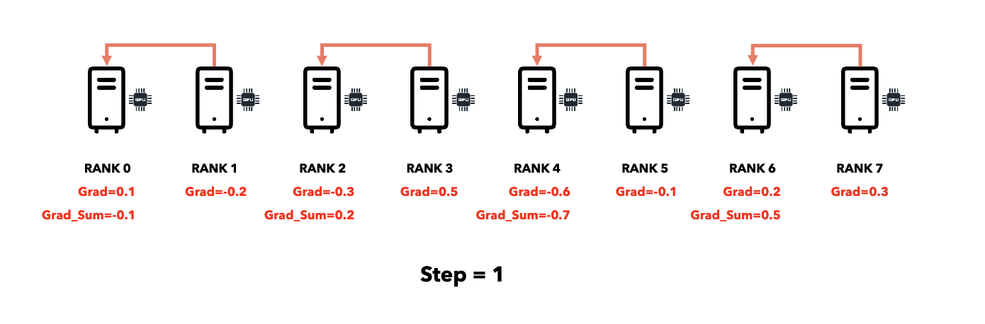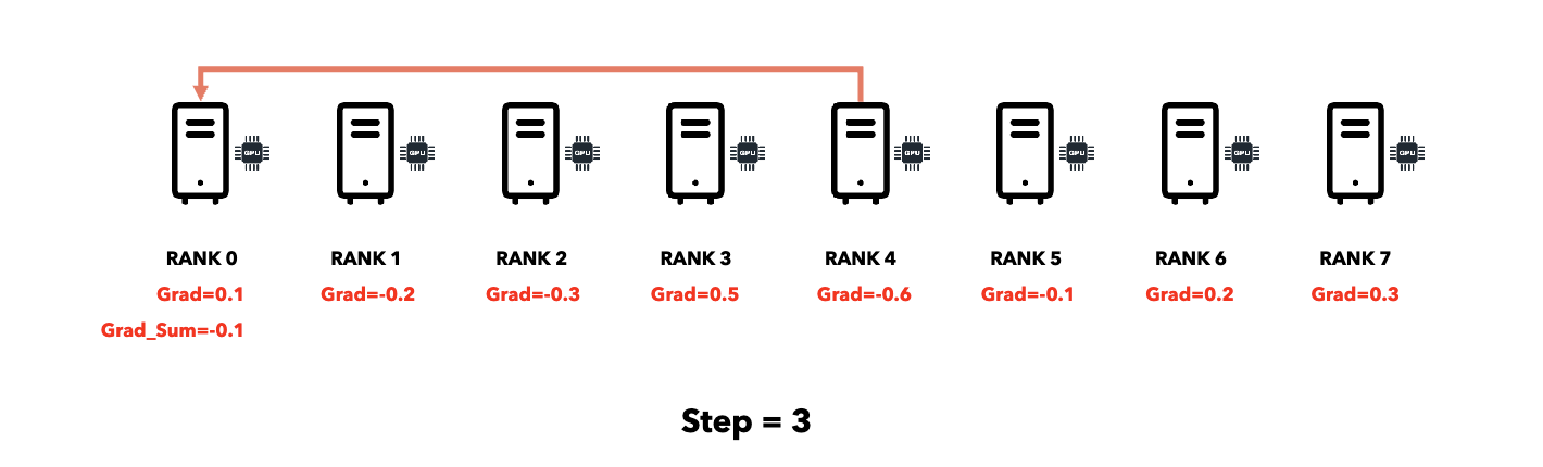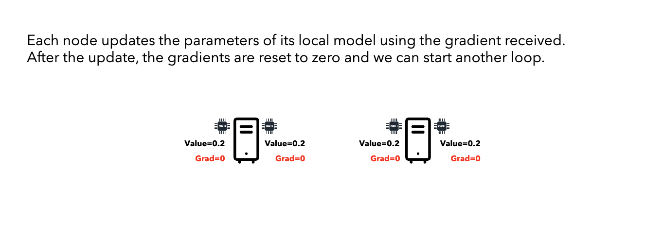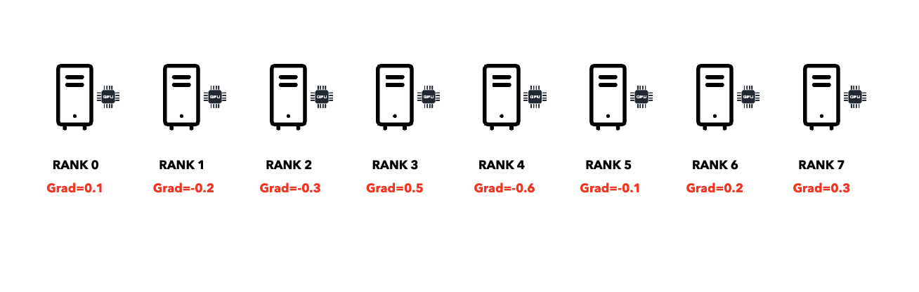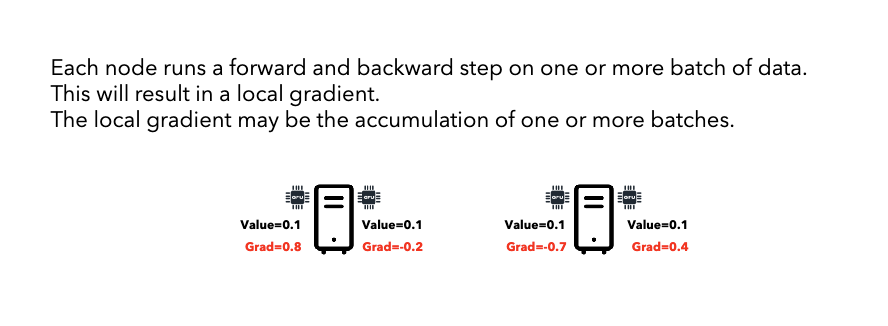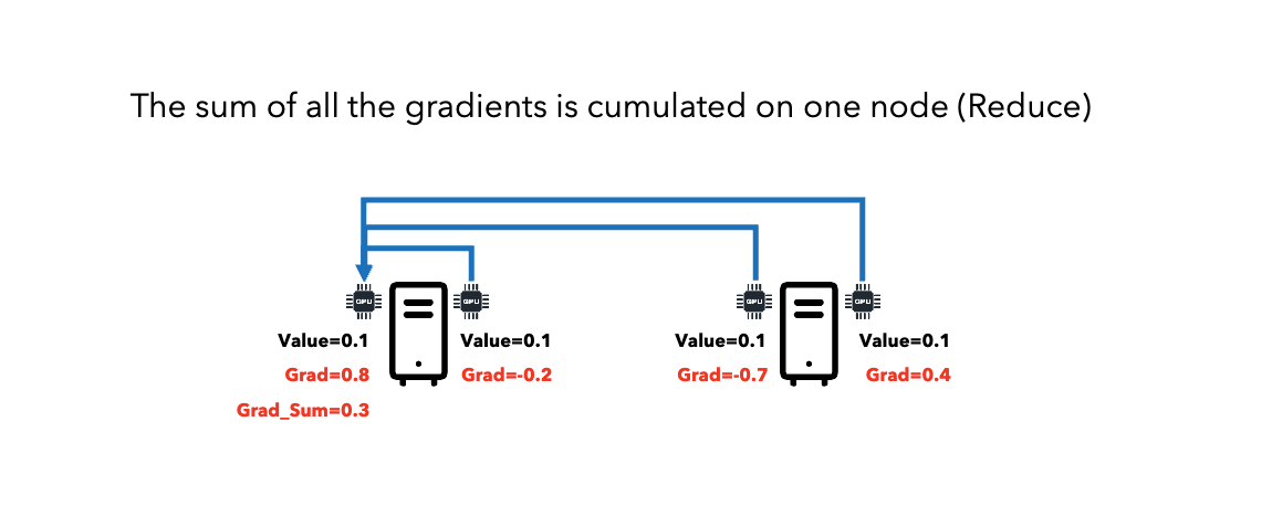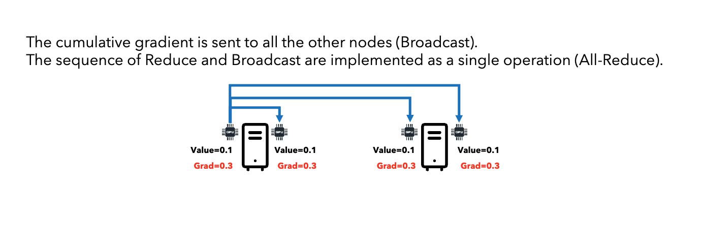 All-Reduce: Sum gradients across all nodes, distribute result to all nodes.