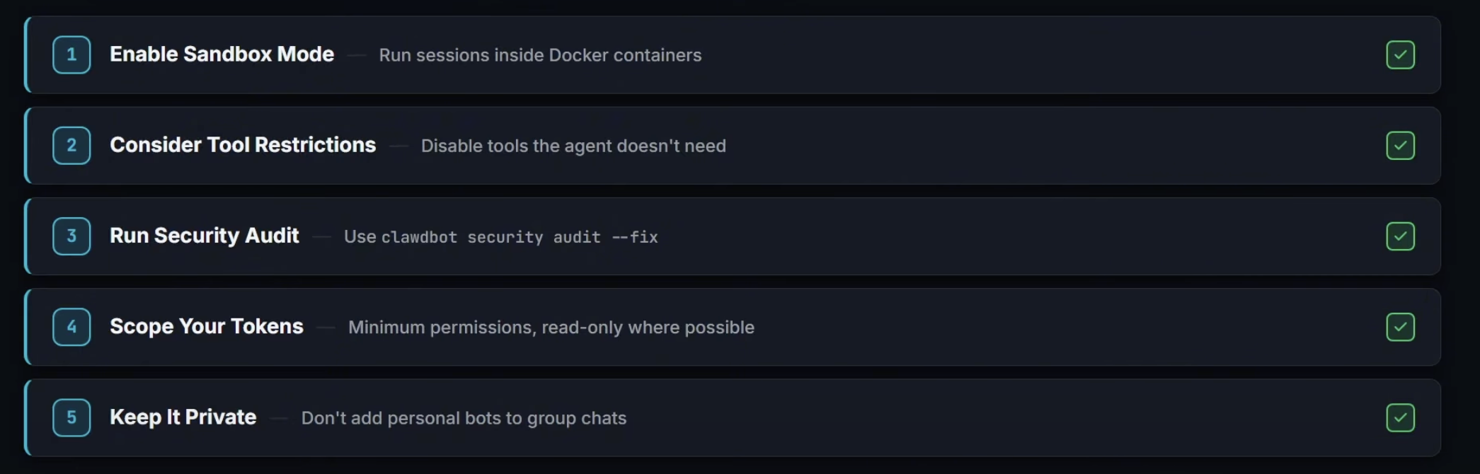 Prompt injection: Malicious users can craft messages that trick the agent into running unintended commands. Smaller models are more susceptible. Mitigate by enabling sandbox mode and restricting tool access for channels that accept messages from untrusted or unknown senders.